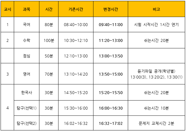 시험지 배부시간을 고려하여 시험 시작 시간이 1시간 늦춰졌고, 각 교시가 끝난 후 쉬는 시간이 30분에서 20분으로 단축되었습니다. 각 과목당 시험시간과 점심시간은 기존과 같습니다.