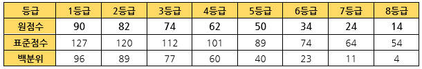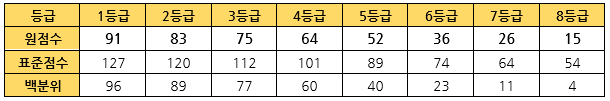 그러나 표준점수로는 학생들이 본인의 성적을 가늠하기에 어려우므로, 입시기관들은 원점수 기준 예상 등급컷도 공개하고 있습니다. 이 예상 등급컷은 참고 정도로만 활용해야 합니다.