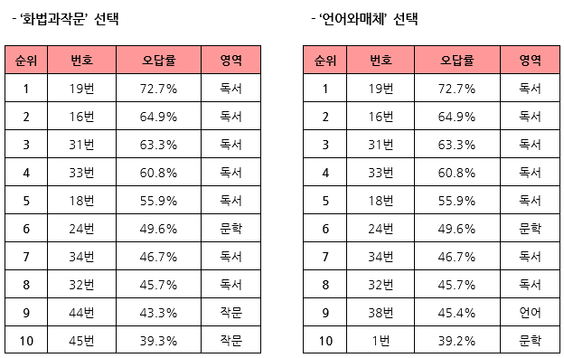‘화법과작문’, ‘언어와매체’ 모두 상위 8문항이 공통과목에서 나타났습니다. 각 선택과목에서 가장 오답률이 높은 문항은 각각 오답률 9위를 차지했고, 두 문항 모두 오답률이 50%가 되지 않습니다. 따라서 이번 시험에서는 선택과목이 비교적 평이하게 출제되었고, 공통과목의 난이도가 높았음을 알 수 있습니다.