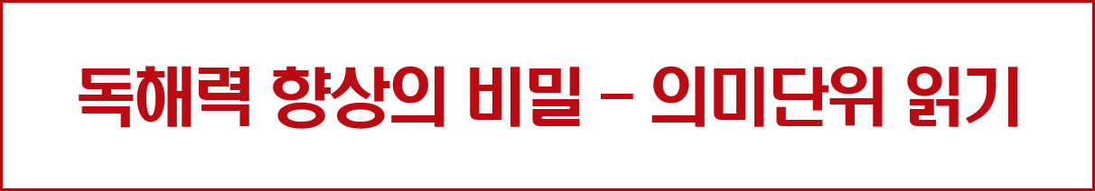 글을 의미단위로 읽는 것은 자연스러운 현상이지만 이렇게 의미단위를 확장시키기 위해서는 의식적인 훈련이 필요합니다. 단순히 글을 많이 읽는다고 해서 의미단위의 범위가 확장되진 않습니다. 즉, 글에 대한 이해력과 기억력을 극대화하기 위해서는 별도의 ‘의미단위 읽기 훈련’을 해야 합니다.