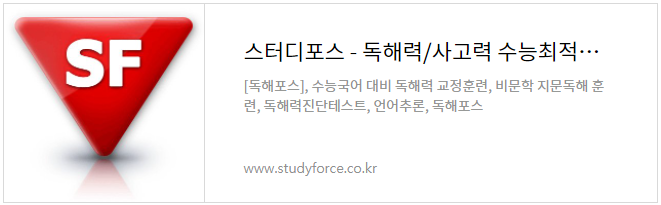 스터디포스 언어과학연구소에서 제공하는 독해력 교정훈련 [독해포스]는 음독, 훑어읽기, 지문부호화 등의 잘못된 독해습관을 교정하는 훈련입니다. 하루에 30분씩, 총 60회의 훈련을 통해 바르고 효율적인 독해습관을 형성할 수 있습니다.